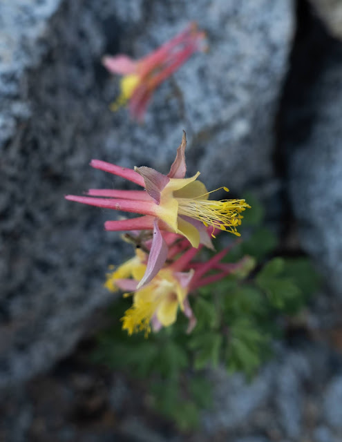 We managed to cover maybe 2 1/2 miles and a third of the climb before the sun caught us. Deep in the shade of the cliff, where the sun doesn't burn them out of existence, we found a number of beautiful pink and yellow columbines.